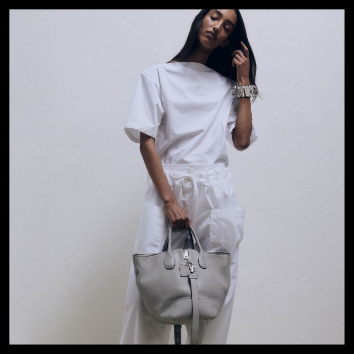 각 잡히지 않은 소프트한 셰이프가 우아한 스윙 백. T 스티칭 디테일과 타원형 토즈 로고를 장식해 더욱 고급스럽다.