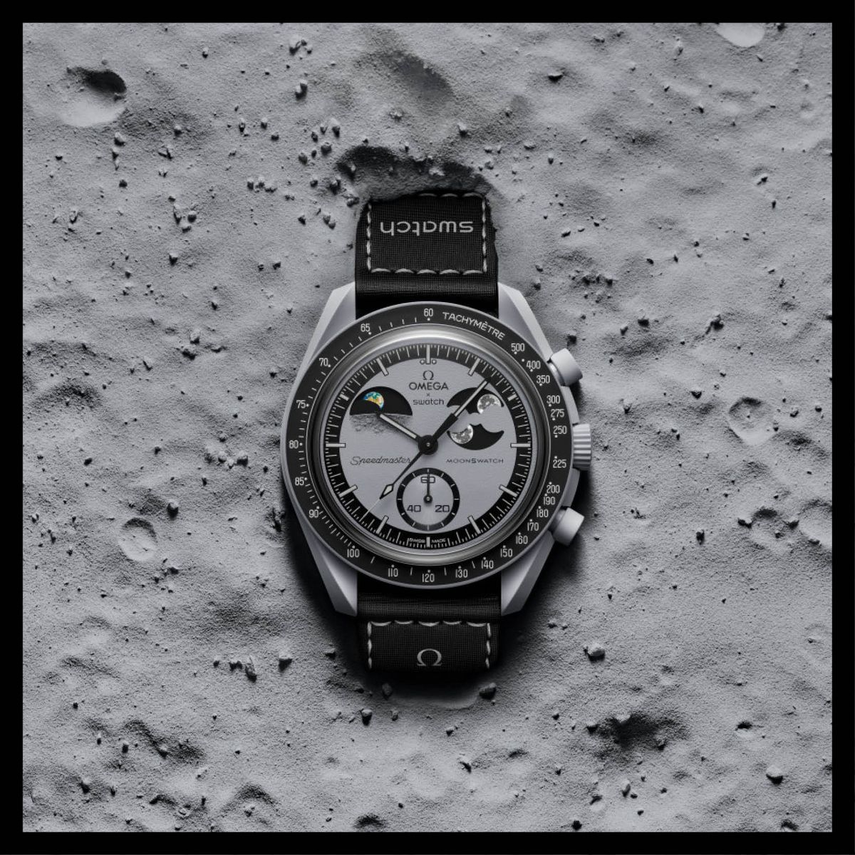 달에서 바라본 지구의 모습을 담은 다이얼과 디지털 프린팅으로 제작한 독특한 그레인 텍스처가 특징이다.
