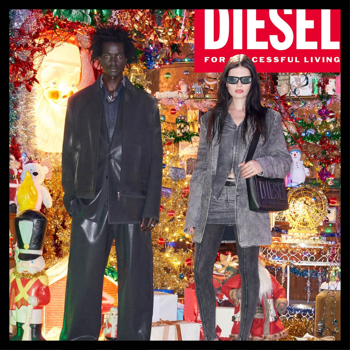 2025 S/S 프리 컬렉션을 착용한 모델들의 절제된 룩과 화려한 크리스마스 장식의 배경이 대비되며 위트를 더했다.