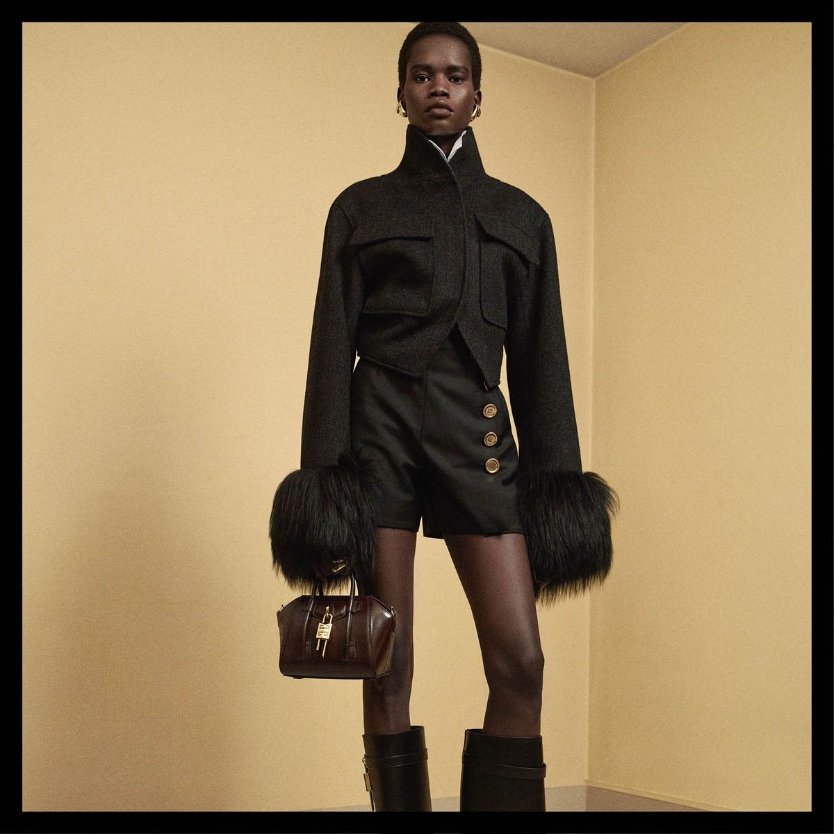 깃털 장식 드레스 를 비롯한 파티 룩과 글로시한 블랙 레더 소재의 쁘띠 부아유, 메탈릭 체인 스트랩의 미니 백 등으로 구성된 스페셜 컬렉션.