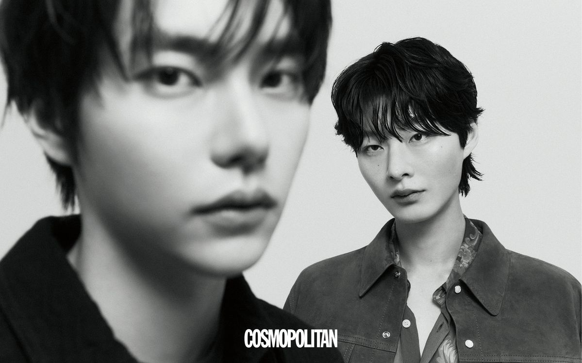 (정현규)셔츠, 티셔츠 모두 Ferragamo. (최현준)스웨이드 재킷, 셔츠 모두 Versace.