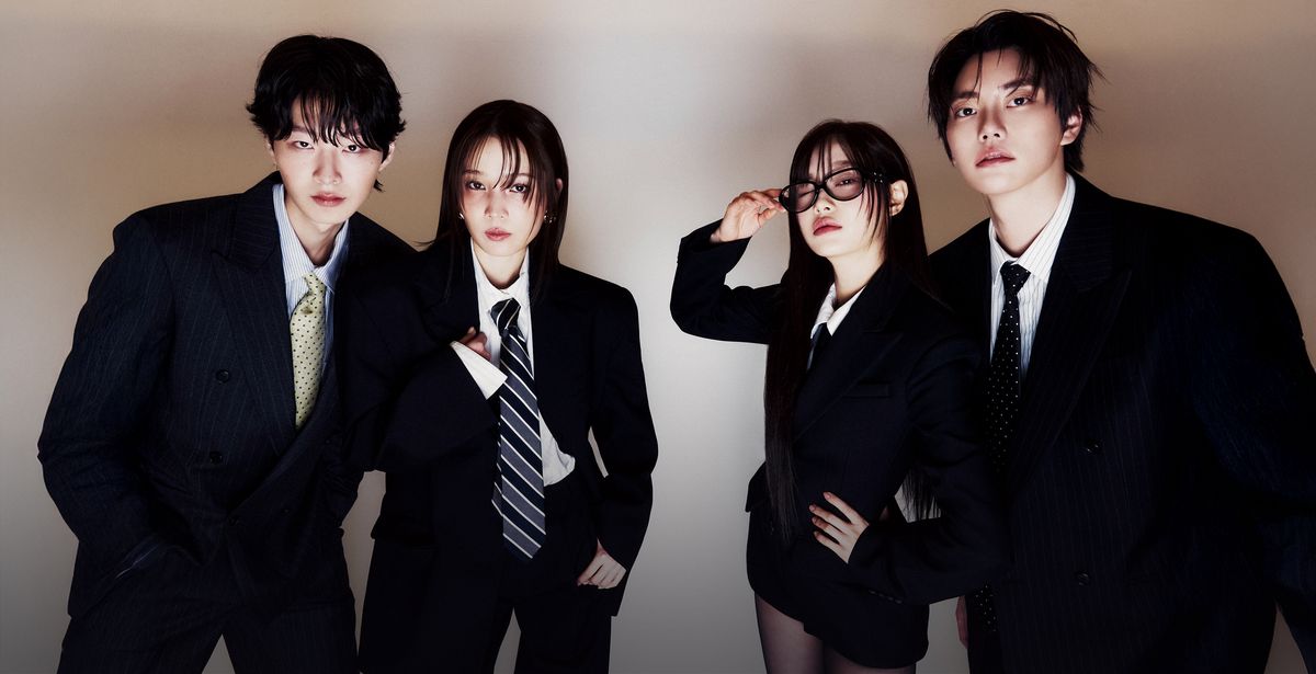 (최현준)슈트 셋업, 타이 모두 Heon Kim. 셔츠 Cos. (윤소희)슈트 셋업 H&M. 귀고리 Ferragamo. 셔츠, 타이 스타일리스트 소장품. (츄)점프슈트 Michael Kors Collection. 안경 Gentle Monster. 셔츠, 타이, 스타킹 스타일리스트 소장품. (정현규)슈트 셋업, 셔츠, 타이 모두 Heon Kim.
