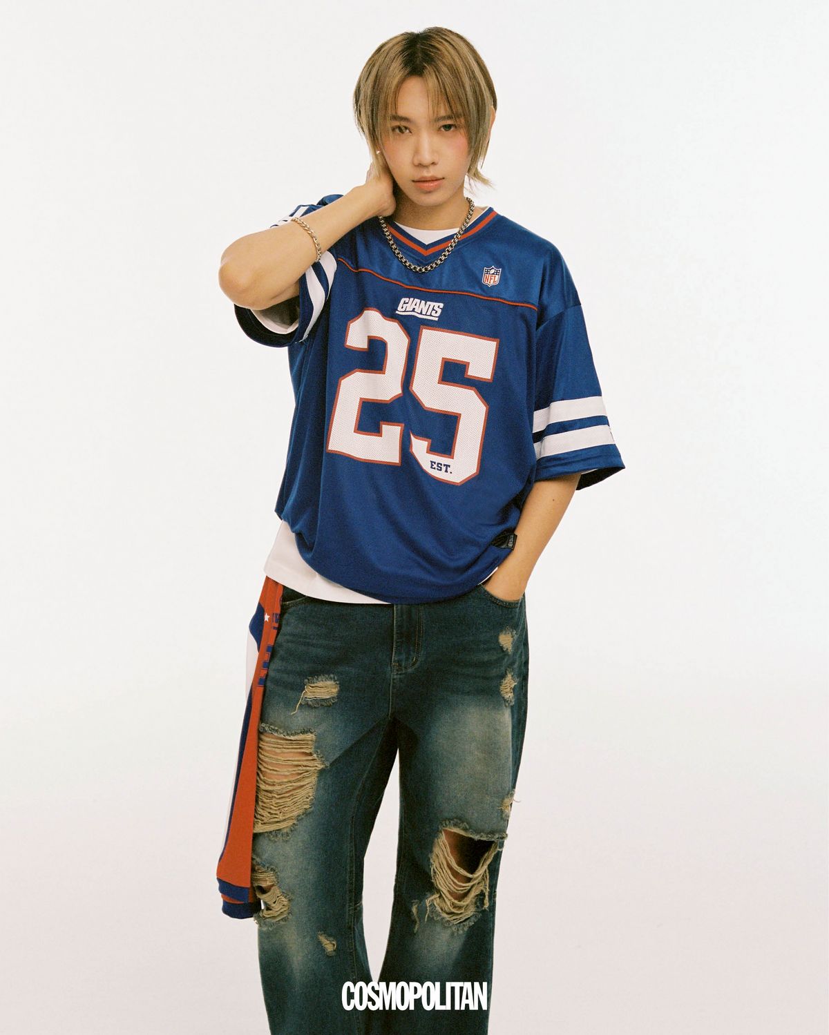 풋볼 티셔츠 Cotchs. 데님 팬츠 Xtonz. 슈즈 Converse. 이너 톱, 목걸이, 팔찌, 암 밴드 스타일리스트 소장품.