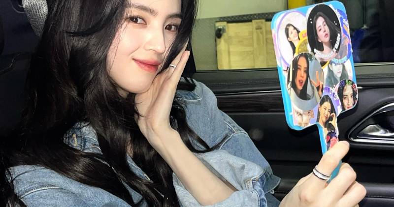 딘디의 브라운-레드 패션. 브라운 톤의 워크 재킷에 티셔츠를 매치하고 레드 스트라이프 프릴 스커트에 빨간 양말로 빈티지한 스타일링을 보여줬네요.