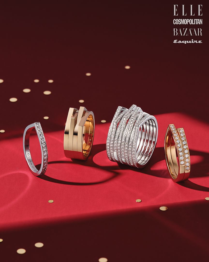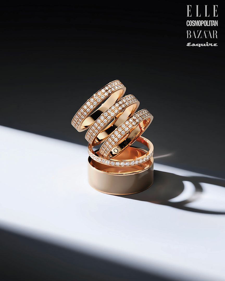 (왼쪽부터) 앙티페 다이아몬드 파베 세팅 화이트 골드 링, 앙티페 4줄 핑크 골드 플레인 링, 앙티페 8줄 다이아몬드 파베 세팅 화이트 골드 링, 앙티페 2줄 다이아몬드 파베 세팅 핑크 골드 링은 모두 가격 미정 REPOSSI.