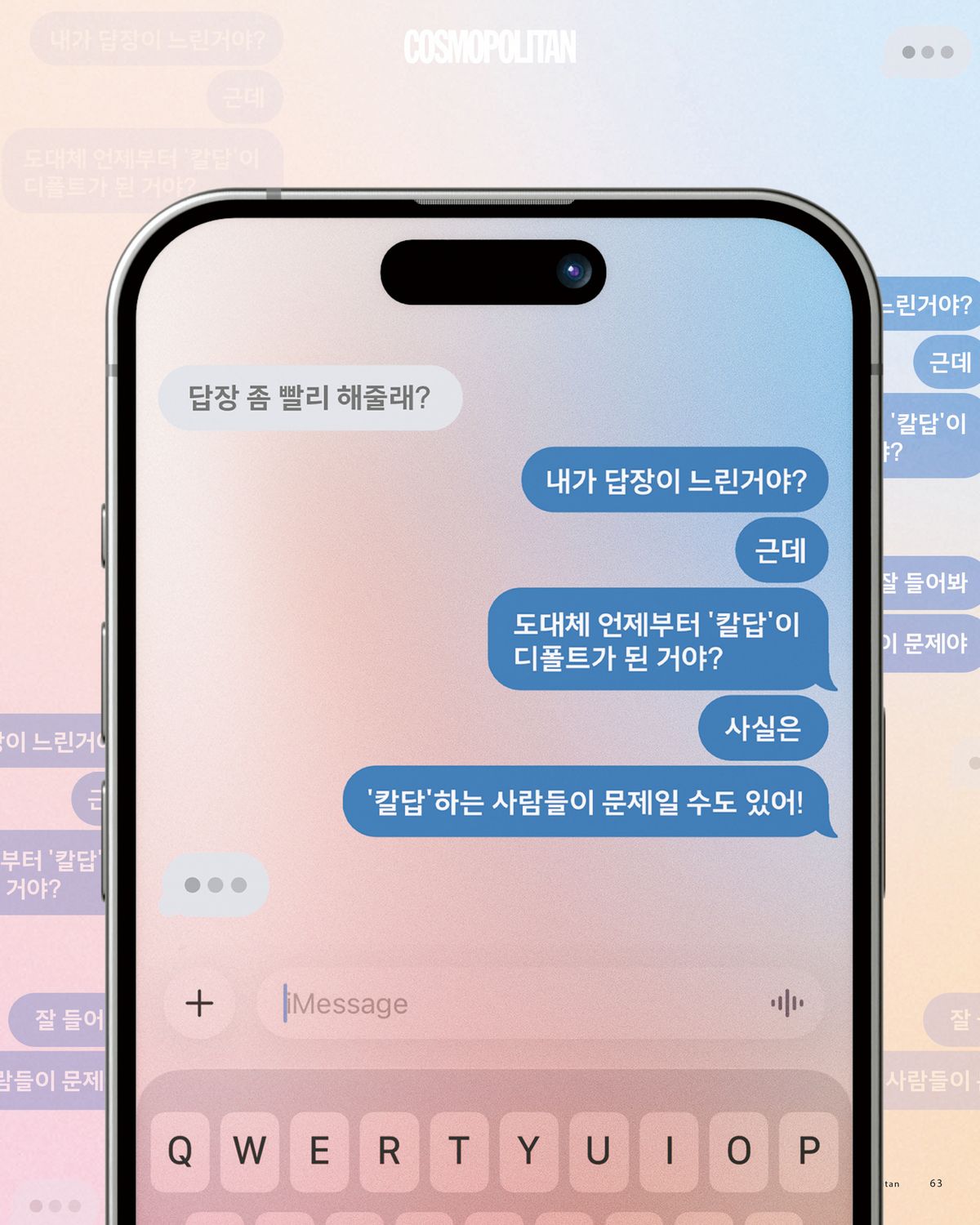 <코스모폴리탄 UK>가 진행한 독자 설문 조사에선 응답자의 70%가 “친구가 24시간 안에 답장을 안 한다고 무례하다 생각하지 않는다”라고 답했다. 켈리 박사는 이렇게 말한다. “스스로만 탓하면 해결이 더 어려워져요. 이건 우리 모두가 직면하는 새로운 사회문제임을 인식하고, 누구에게나 즉각 답장하기란 불가능하다는 걸 받아들여야 해요. 자신의 정신 건강을 완전히 희생하지 않고서는 말이죠. 그렇게 이해하면 죄책감도 훨씬 줄어듭니다.” 만약 당신이 ‘답장 잘하는 사람’이지만 사실은 메시지 스트레스에서 벗어나고 싶다면, 켈리 박사의 조언을 명심하자. “우리가 진짜 중요하게 여기는 것이 무엇인지 돌아보세요. 그리고 그 기준에 맞춰 기술 사용 방식을 조정해야 합니다. 휴대폰이 우리의 삶을 좌지우지하게 둬서는 안 돼요.” 통제권을 되찾는 것이 결국 모든 사람에게 스트레스를 줄여준다고 그는 말한다. 결론은 이것뿐이다. 내가 답장을 안 해도 기분 나쁘게 받아들이지 말아줘. 그냥 지금은… 너랑, 그리고 누구와도… 말하고 싶지 않은 것뿐이니까.