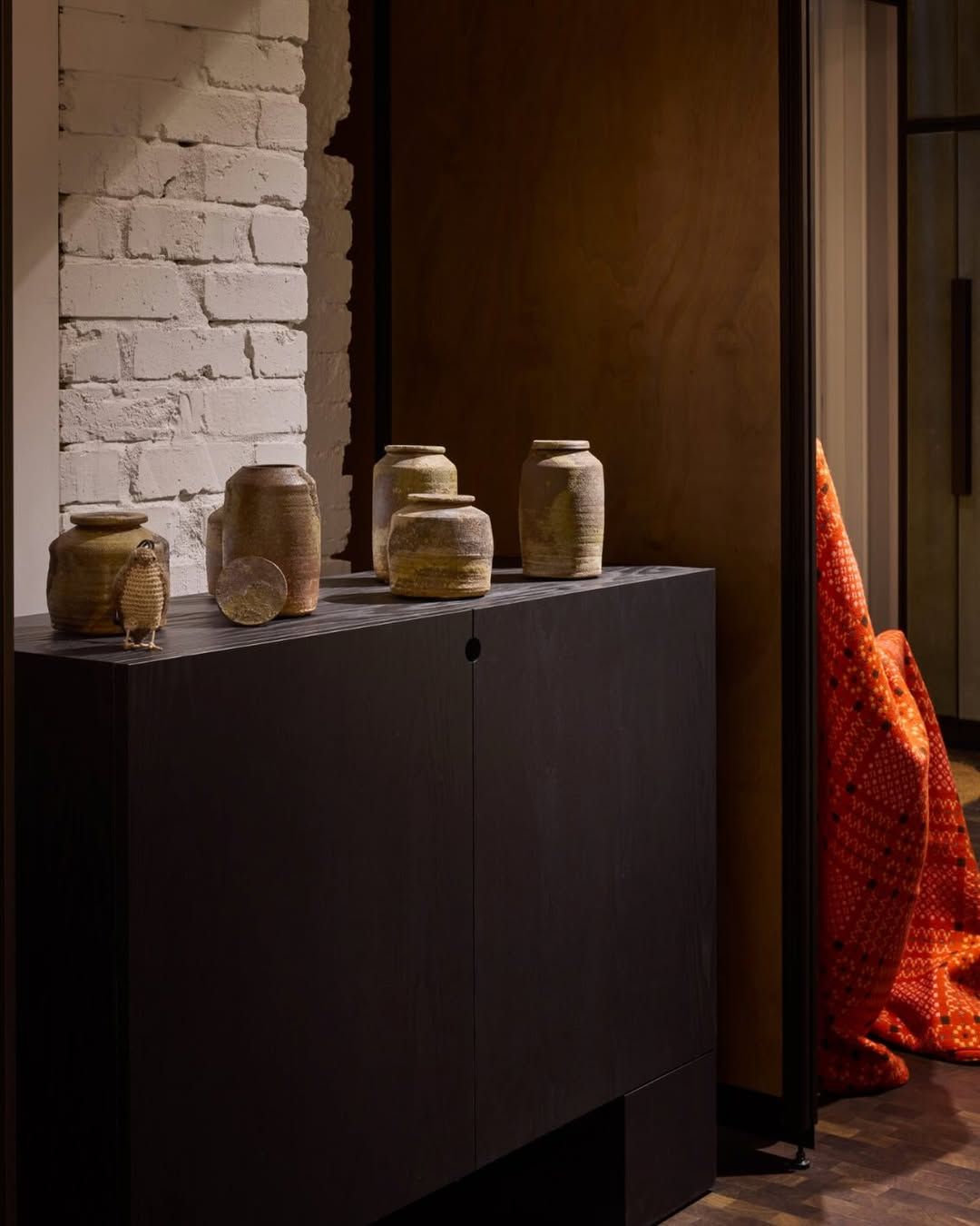 폴리 리스터의 더 다이웍스와의 협업 쿠션이나 라벤더 필로우는 식물 염료로 물들인 색감이 은은하게 퍼져, 공간 전체에 생기를 불어넣는다. 특히 인상 깊었던 건 영국 아티스트 키라 프레이의 조형미가 돋보이는 벽등과 조각들. 그리고 금속과 패브릭 등이 얽힌 형상은 촛불 모티브를 빌려 미묘한 긴장감을 주는데 이게 바로 조나단이 사랑하는 '불완전한 아름다움'이 아닐까.