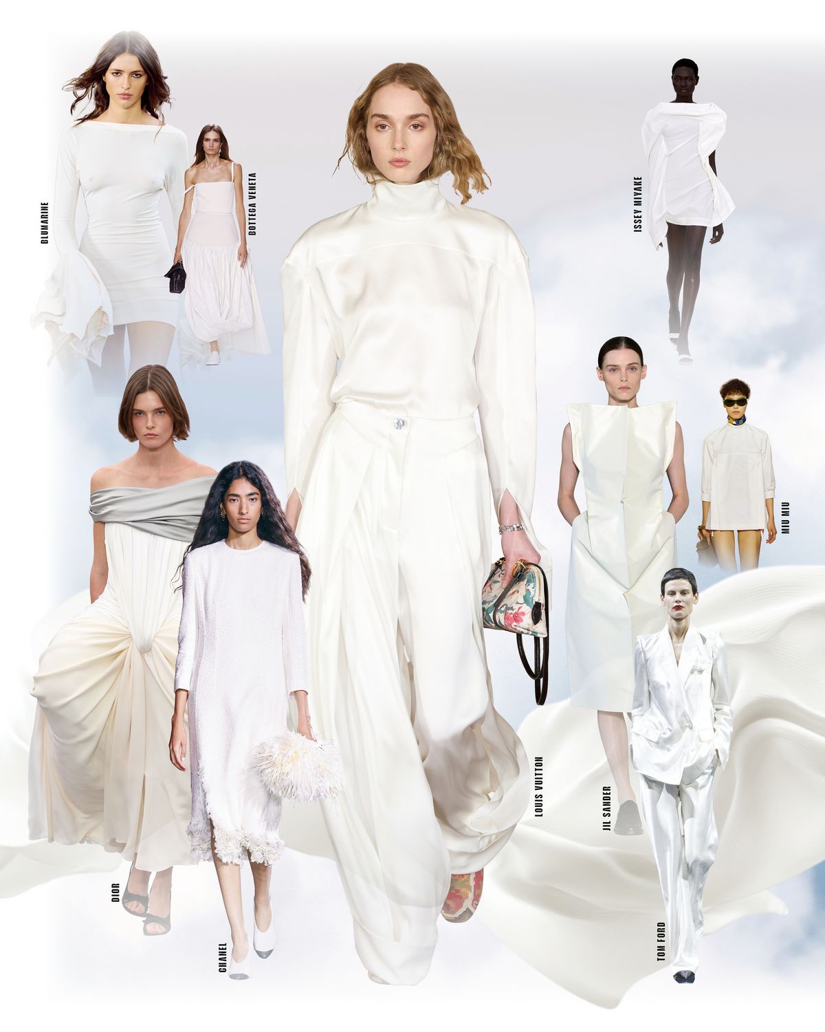 클라우드 댄서는 미묘한 미색이 감도는 부드러운 톤으로 시선을 편안하게 머물게 한다. 절제와 균형이 하나의 가치로 떠오른 지금, 우리가 현재 필요로 하는 안정과 회복의 정서를 차분하게 전파한다. 팬톤은 “디지털 기기 사용과 정보 소비가 늘어난 환경에서 시각적 피로를 덜어주는 차분한 색에 대한 선호가 뚜렷해지고 있다”라고 설명했다. 이 기조는 2026 S/S 컬렉션 전반에서도 확인된다. “이게 정말 트렌드 컬러라고?” 할 정도로 밋밋함을 넘어 때로는 존재감마저 미미한 색이 런웨이에 대거 등장했다고 하면 고개를 갸웃할지도 모른다. 그도 그럴 것이 패션은 과감한 색의 조합과 대담한 디자인으로 브랜드 정체성을 계속해서 이야기하기 바빴으니까. 각 하우스는 클라우드 댄서를 저마다 다르게 해석했지만 공통적으로 향한 지점은 분명하다. 디올과 끌로에는 케이프처럼 상체를 넓게 덮은 톱, 풍성한 플리츠스커트 등을 선보이며 하늘하늘한 실루엣 위에 클라우드 댄서를 입혀 마치 구름이 몸을 감싸는 듯한 방식으로 풀어냈다. 질샌더와 톰포드는 보다 정제된 방식으로 다뤘다. 군더더기 없는 테일러링과 구조적인 선 위에 놓인 클라우드 댄서는 장식적인 역할을 하기보다 옷의 균형을 지탱한다. 보테가 베네타도 장식을 제거한 드레스를 앞세웠다. 밑단의 러플 디테일을 제외하면 설명할 것이 없을 만큼 단순하다. 샤넬 또한 미니멀한 드레스와 셋업을 줄이어 화려하고 요란한 장면이 아닌 안정적인 흐름을 만들었다.