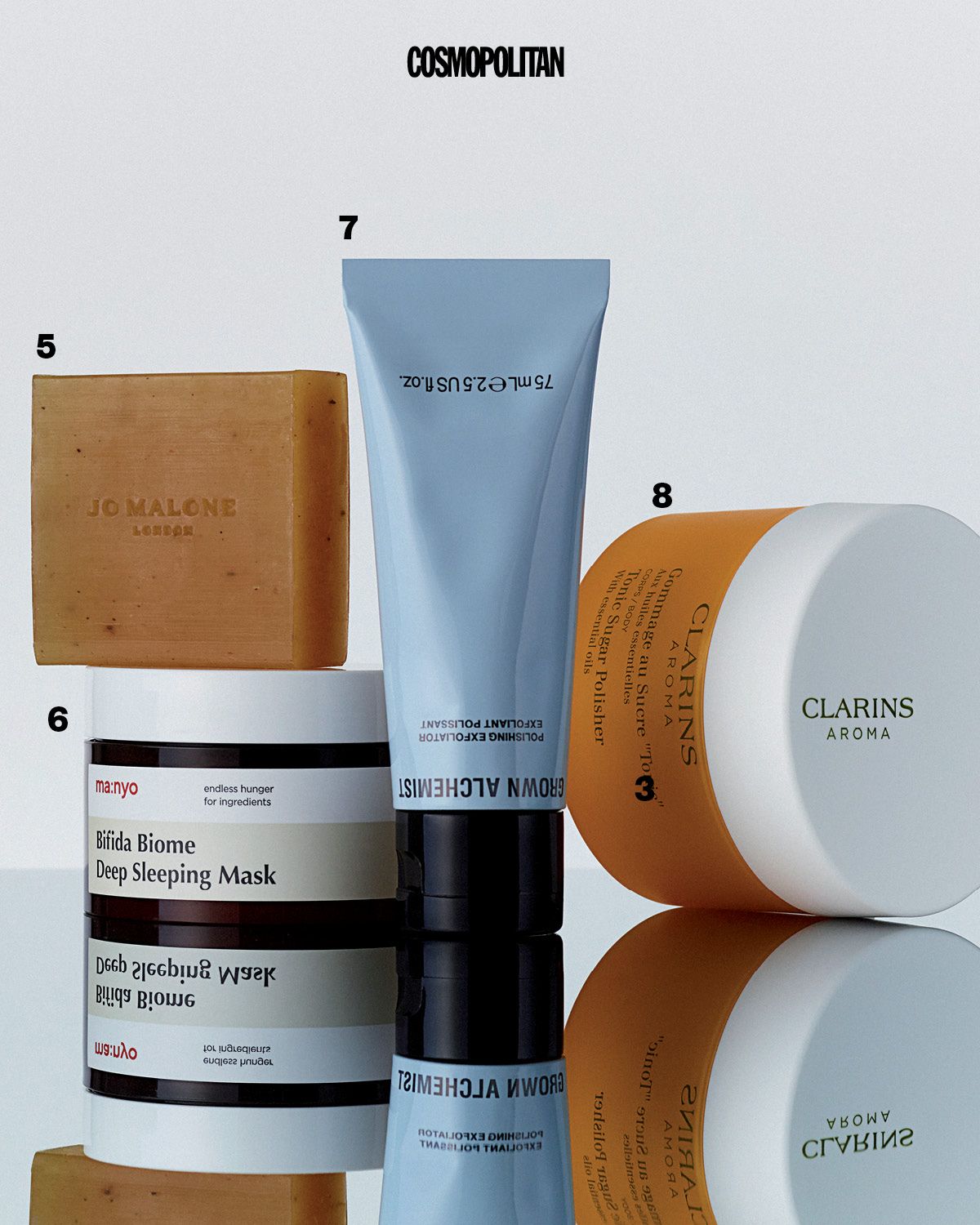8 _ 소금 어서 오시고, 설탕도 어서 오실게요. 솔트가 먼저 묵은 각질을 빠르게 정리하고, 뒤이어 슈거가 이어받아 피부를 말랑하게 만든다. 에센셜 오일 베이스라 피부에 닿자마자 부드럽게 녹고, 헤이즐넛 오일과 시어버터가 그 위를 코팅해 보디로션을 급하게 찾지 않아도 된다. 제라늄, 로즈우드, 민트까지 심신을 안정시키는 아로마 컬래버로 샤워만으로도 하루의 피로가 풀리는 듯하다. 아로마 토닉 슈가 폴리셔 6만6천원 Clarins.