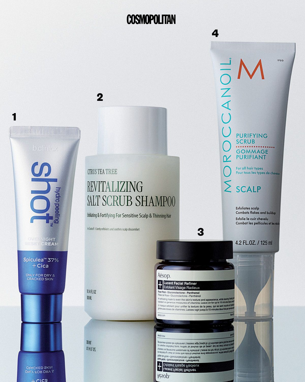 4 _ 샴푸 전 물 묻힌 두피에 가르마를 타고 쓱쓱. 팁이 뾰족해 헤어라인 따라 바르기 편하고, 손에 묻히지 않아도 돼 간편하다. 각질 제거 제품 특유의 까슬함을 예상했다면, 편견을 단번에 깨준다. 문지르는 순간 미세한 거품이 올라오면서 자극은 줄고, 헹궈내는 순간 퍼지는 쿨링감이 두피 열감까지 확 낮춘다. 비결은 두피 표면의 오염 물질을 제거하는 아르간 껍질 가루와 청량한 마무리감을 내는 멘톨 덕분. 퓨리파잉 스크럽 4만9천원 Moroccanoil.