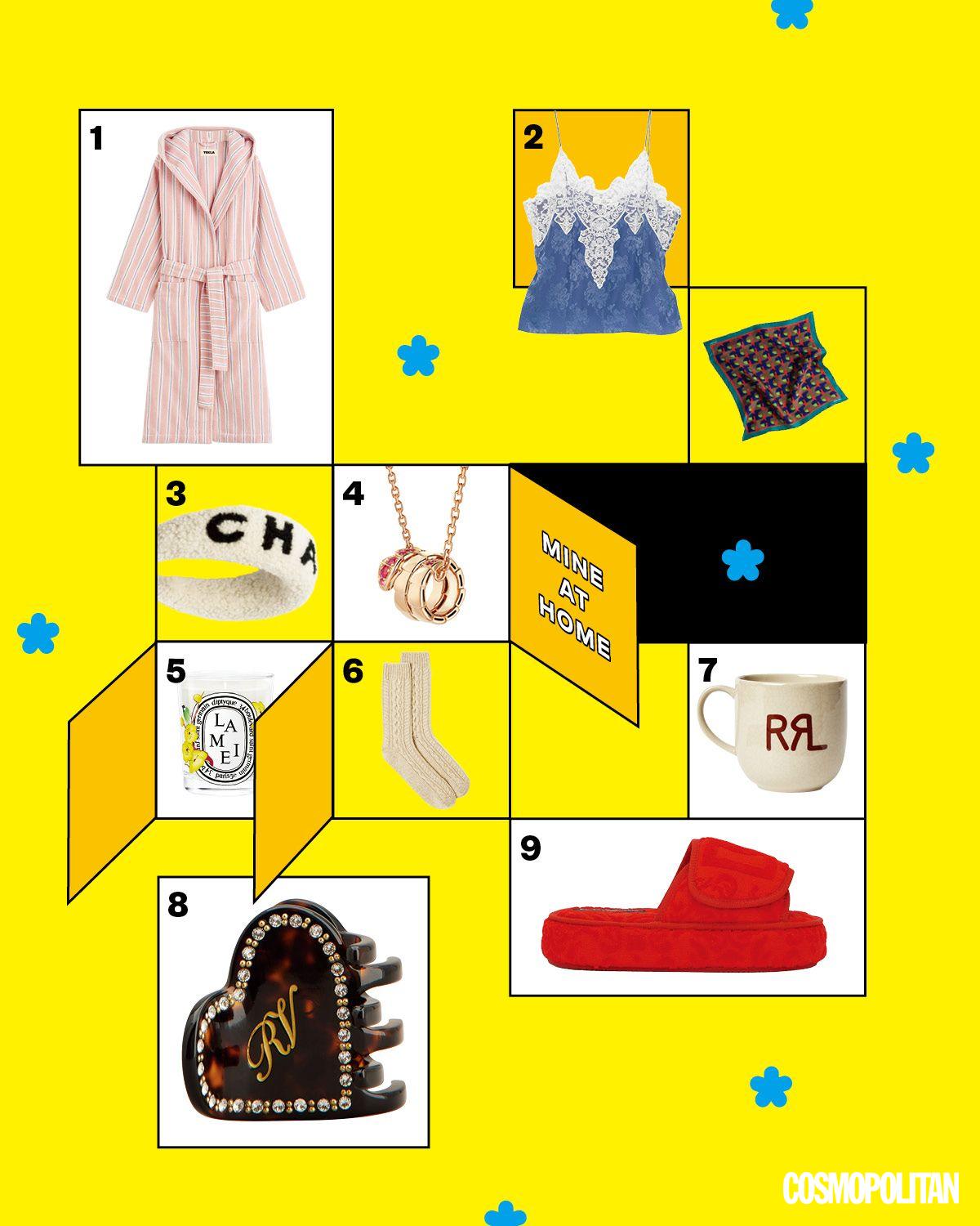 1 테리 소재 스트라이프 배스 로브 43만원 Tekla. 2 레이스 장식 실크 캐미솔 가격미정 Chloé. 3 그래픽 패턴 스카프 44만원 Miu Miu. 4 부클레 헤어밴드 가격미정 Chanel. 5 뱀 모티프에 루비 세팅한 세르펜티 네크리스 7백40만원 Bvlgari. 6 아티스트 지난 람과 협업한 리미티드 라메이 캔들 가격미정 Diptyque. 7 베이비 캐시미어 삭스 가격미정 Loro Piana. 8 레드 로고 머그 세트 25만9천원 RRL. 9 하트 모양 헤어클립 가격미정 Roger Vivier. 10 테리 코튼 플랫폼 슬리퍼 60만원 Dolce&Gabbana.