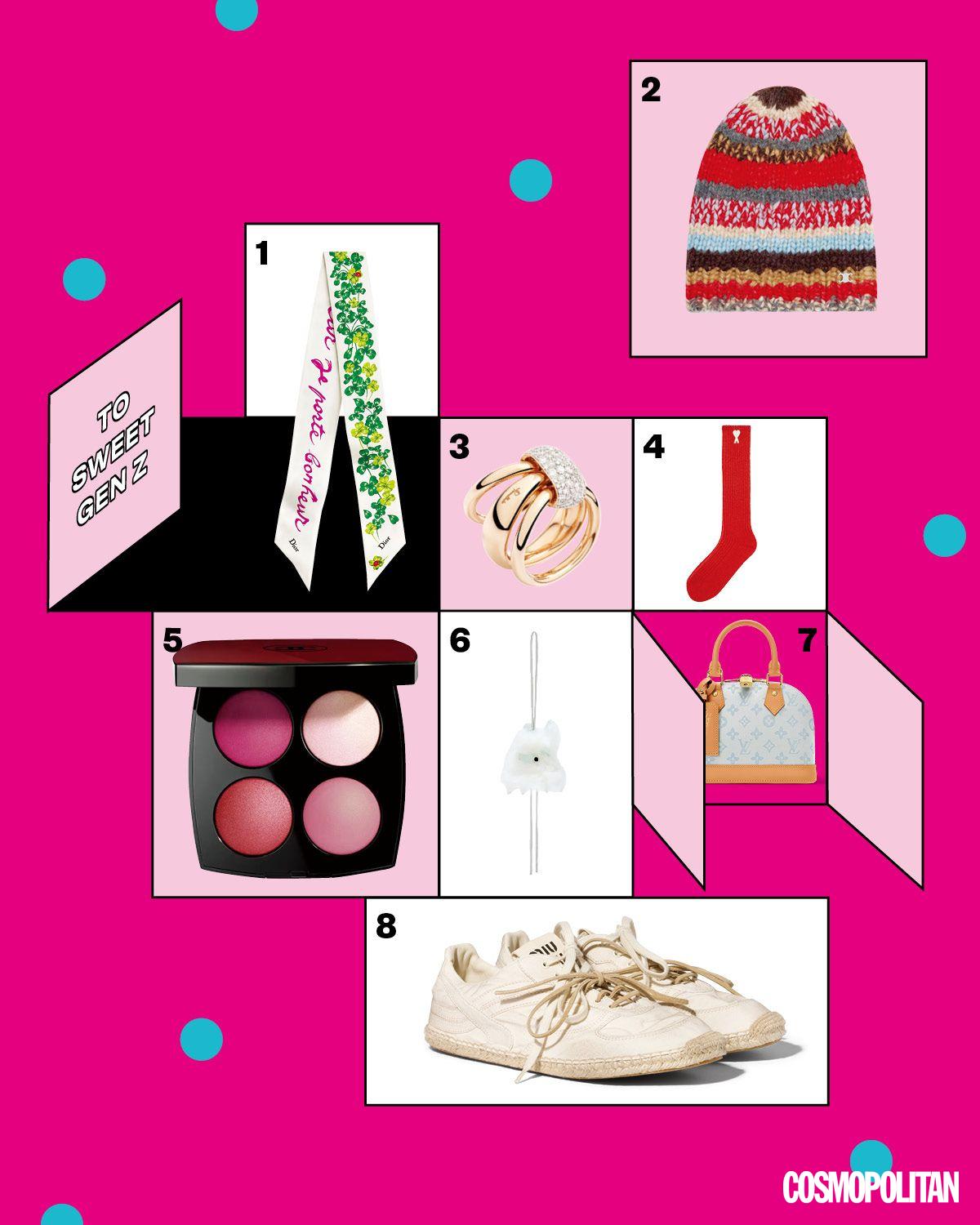 1 클로버 모티프 미차 스카프 34만원 Dior. 2 멀티 컬러 알파카 울 비니 72만원 Celine. 3 파베 세팅한 다이아몬드를 연결 고리로 결합한 형태의 로즈 골드 투게더 링 가격미정 Pomellato. 4 로고 포인트 레드 삭스 14만원 Ami. 5 루쥬 느와르 콩피당스 아이섀도우 & 블러셔 팔레트 13만3천원 Chanel Beauty. 6 시어링 장식 토끼 참 1백20만원 Loewe. 7 모노그램 패턴 알마 BB 백 3백49만원 Louis Vuitton. 8 라피아 소재를 가미한 스니커즈 가격미정 Miu Miu.