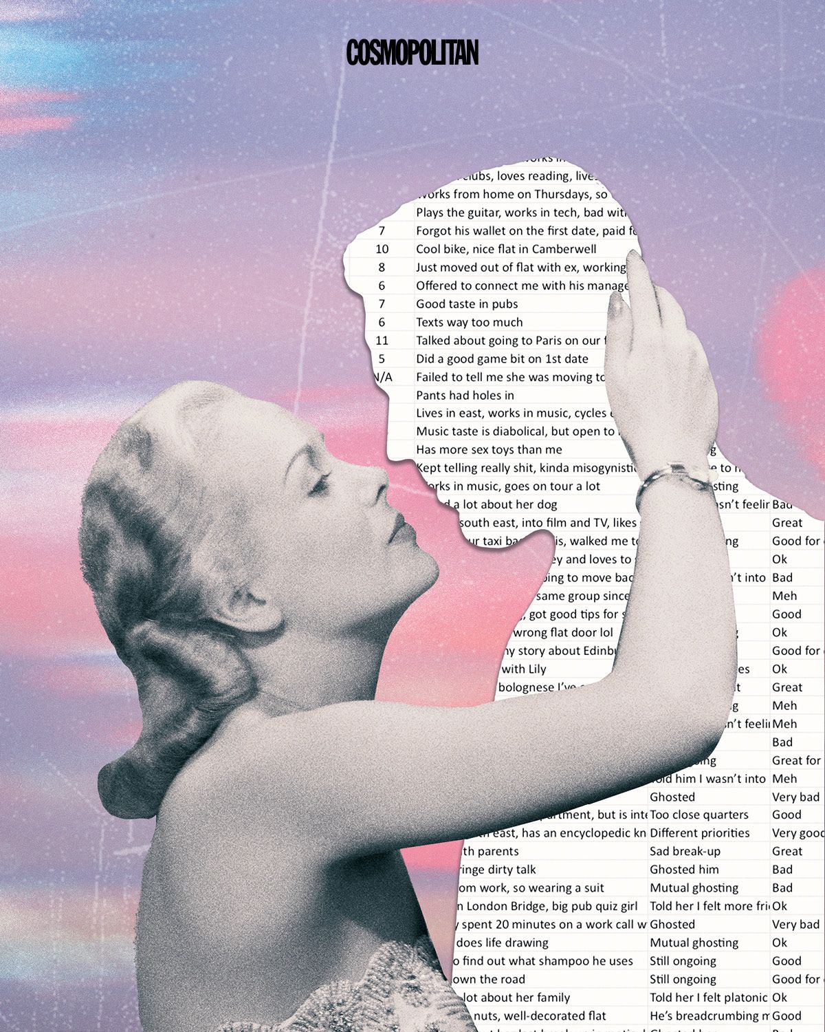 2024년 당시, 연애 경력 10년에 빛나는 29살 몰리는 모든 데이트를 스프레드시트에 기록했다. “만난 사람들의 이름, 데이트한 날짜, 만나게 된 경위, 진도는 어디까지 나갔는지, 데이트에서 뭘 했는지, 만나는 도중에 어떤 불만이 있었는지부터 외모, 별자리까지 기록했죠.”