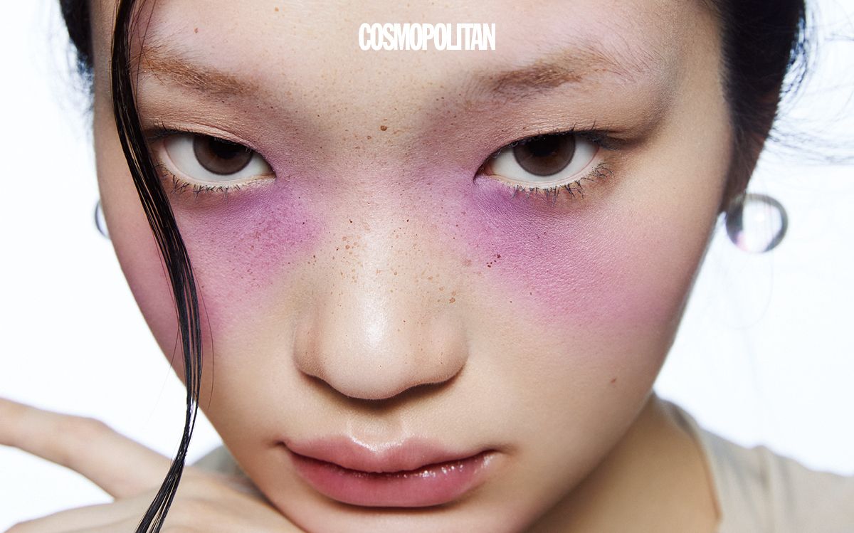 눈 아래부터 볼 중앙까지, 라일락 컬러가 숨결처럼 번진다. 또렷한 치크 라인 대신, 광대뼈 아래를 중심으로 디올의 디올쇼 5 꿀뢰르 아이 팔레트865 핑크 롤리팝과 나스 싱글 아이섀도우 술탄을 믹스해 색을 퍼뜨리듯 얹은 룩. 눈가는 음영을 최소화해 맑게 두고, 어두운 브라운 섀도로 주근깨를 더해 키치하게 마무리했다.