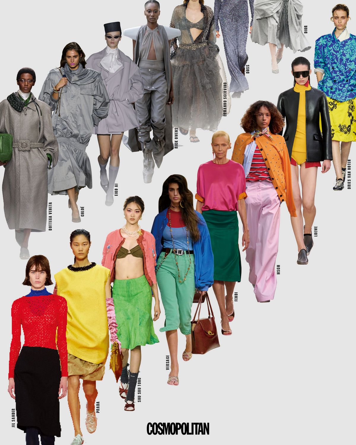 자기표현의 시대, 컬러 하나로 추구미를 표현하기엔 부족한 요즘이다. 갖가지 색과 프린트가 활기를 찾는 S/S 시즌엔 더더욱! 그리하여 이번 시즌 런웨이엔 양극단의 컬러 플레이가 질주하는 모양새다. 먼저, 지난 몇 시즌 지속된 뉴트럴과 어스 컬러의 강세를 누르고 혜성처럼 등장한 원색 컬러다. 빨강, 초록, 파랑 등 하나로도 충분한 비비드 컬러들이 두세 가지 이상 레이어드를 거듭하며 강렬한 장면을 연출했다. 프라다, 질샌더, 로에베, 펜디 등 그간 원색 컬러를 잘 볼 수 없던 하우스에서 등장한 흐름이라 더욱 흥미로운 부분. 정반대의 매력을 뽐내는 또 다른 컬러 트렌드는 회색이다. 물기라곤 하나도 남아 있지 않은 듯 차가운 인상의 데저트 그레이 컬러는 보테가 베네타, 끌로에, 막스마라 등 빅 하우스 곳곳에 깊이 침투했다. 매니시한 회색 슈트를 떠올렸다면 오산. 리본과 빅토리안 실루엣으로 점철한 새로운 얼굴의 디올을 표현하는 데 주도적으로 쓰였을 뿐 아니라, 실키한 소재의 드레스로 분하는 등 우아하고 사랑스러운 이미지로 반전을 꾀했다.