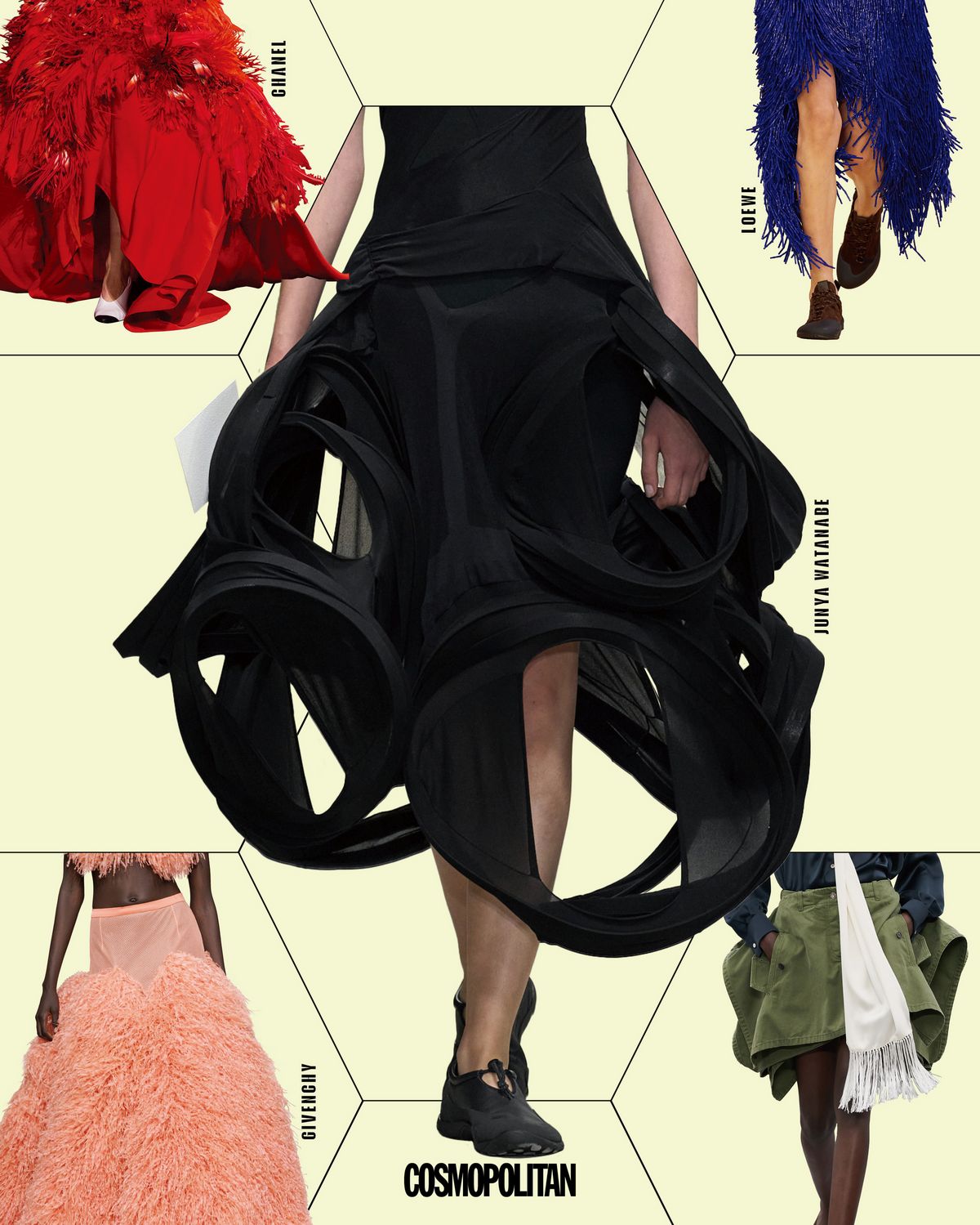 패션계가 스커트에 주목했다. 아주 과장되고 화려한 방식으로. 로코코 시대의 귀부인이 입는 드레스처럼 부풀고 구조적인 스커트 말이다. 몇 시즌 이어져온 미니멀리즘에 대한 반항으로 눈에 보이는 즐거움을 향한 욕구가 증가한 까닭이다. 준야 와타나베처럼 기하학적이거나, 사카이처럼 익숙한 형태의 스커트를 뒤집어서 표현하는 등 스커트에 실험적인 아이디어를 적극적으로 대입했다. 특히 이번 시즌엔 새로 데뷔한 디렉터들이 자신의 존재감과 기술력, 예술성을 보여주고자 과감한 시도를 이어갔다. 소재 또한 다채롭다. 로에베는 움직임에 따라 자연스럽게 흔들리는 프린지를 사용해 룩에 리듬감을 선사했다. 샤넬과 지방시는 깃털 스커트로 풍성하고 입체적인 효과를 연출했다. 드라마틱한 스커트는 비단 롱스커트에 한정된 이야기가 아니다. 디올은 조형적인 주름으로 보다 형태감 있고 풍성한 미니스커트를 선보였다.