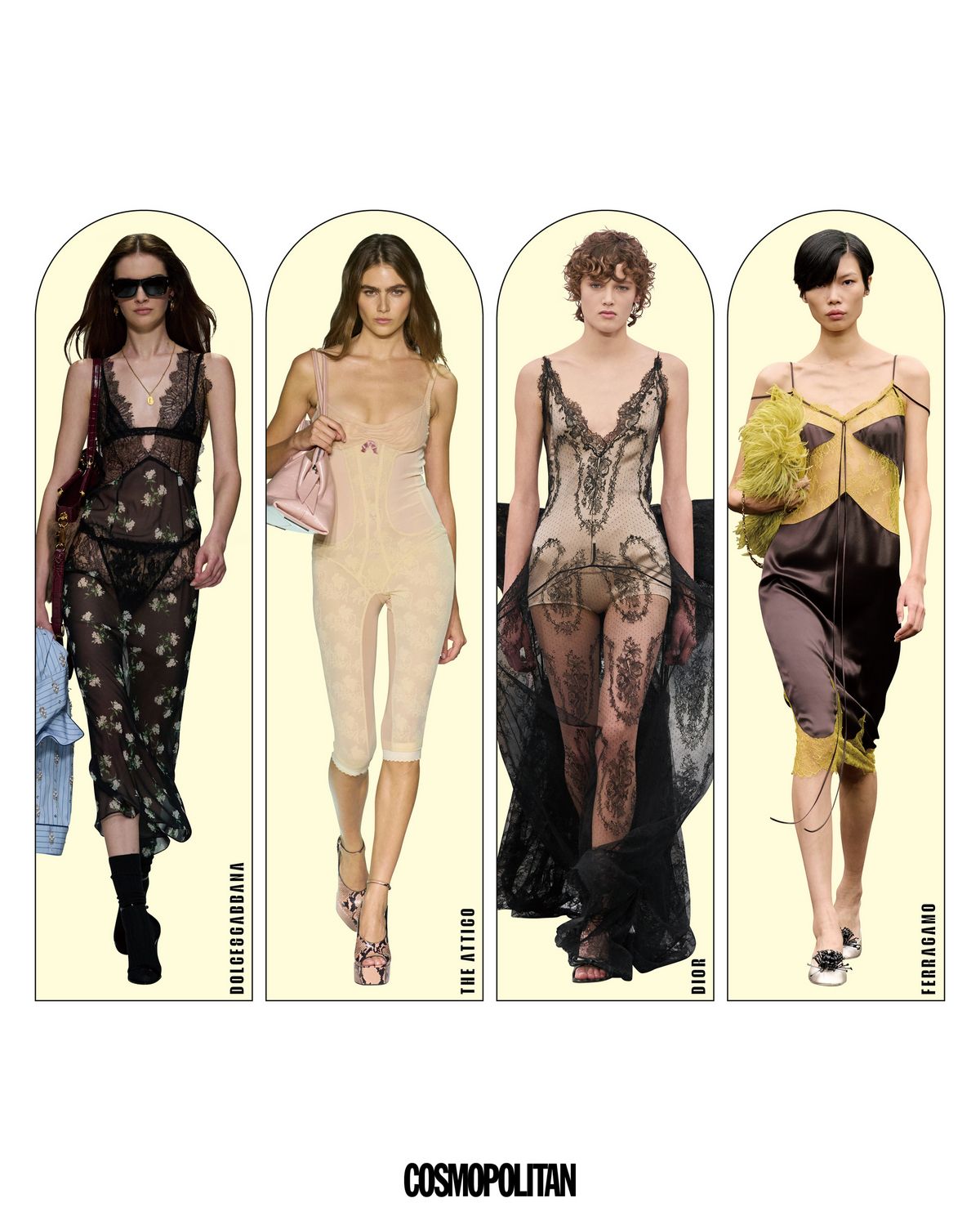 관능적인 룩이 런웨이에 대거 등장했다. 안과 밖의 경계를 허물고, 사회적 시선으로부터 신체를 해방시키는 저항적 측면에 그 의미가 있다. 사적인 공간에서만 입을 것 같은 란제리 룩을 활용한 ‘부두아’ 룩이 대표적이다. 프랑스어로 귀족 여성이 머무는 침실을 뜻하는 ‘Boudoir’라는 단어에서 이름을 따온 이 룩은 슬립 드레스, 캐미솔 등을 활용해 고급스럽고 우아하게 표현하는 것이 특징이다. 깃털 클러치와 레이스 슬립 드레스를 함께 매치한 페라가모처럼 말이다. 나아가 디아티코는 키치한 올인원 거들을 런웨이에 등장시켰다. ‘드러내기’ 또한 주목해야 할 포인트. 톱 안에 꼭꼭 감춰두었던 브라톱을 의도적으로 드러내며 색다른 스타일을 완성했다. 부두아 룩과 마찬가지로 신체적 자유와 당당함을 표현하며 완벽한 기성복에 반항하는 흐름이다. 프라다처럼 옷의 본질을 해체한 듯, 깊게 파인 드레스나 시스루 셔츠 위로 드러난 브라톱은 내면의 아이템을 표출해 신선한 긴장감을 더한다.