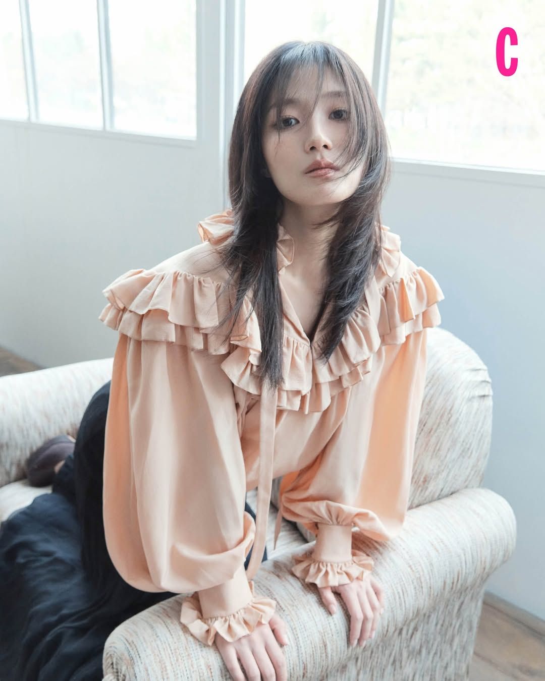 이번 촬영에서는 헤어와 착장을 여러 차례 바꾸며 다채로운 분위기를 시도했습니다. 첫 번째 룩에서는 헤어를 자연스럽게 풀어 바람에 흩날리는 결을 살렸고, 서늘하면서도 시크한 이미지를 완성했어요. 여기에 언더 마스카라가 더해지며 그 분위기를 한층 더 배가시켰죠. 무엇보다 이 스타일이 기대 이상으로 잘 어울려, 해당 헤어로만 세 벌의 착장을 소화했어요. 특히 밝은 무드로 촬영한 핑크 컬러의 에르마노 설비노 원피스 컷은 현장 반응이 유독 뜨거웠는데요. 배우는 마치 자신의 퍼스널 컬러를 입은 듯 가장 편안하고 즐겁게 촬영에 임했습니다. 환하게 웃는 순간마다 현장 공기까지 함께 밝아졌어요. ‘혜피니스’라는 이름이 왜 그토록 잘 어울리는지 단번에 실감한 순간이었죠.