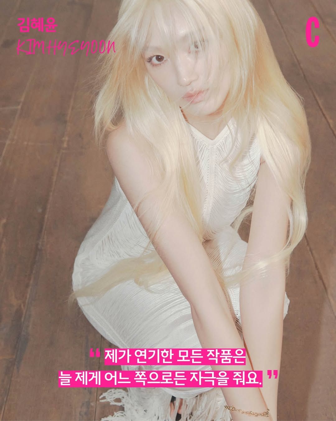 」그리고 이날 촬영의 하이라이트였던 금발 헤어 도전. 김혜윤 배우는 금발은 태어나서 처음이라고 했는데요. 물론 실제 염색이 아닌 가발로 진행했지만, 완성도는 기대 이상이었어요. 헤어 실장님은 현장에서 배우의 두상에 맞춰 기장을 섬세하게 다듬었고, 그 위에 포토그래퍼의 감각적인 연출이 더해지면서 완성도 높은 결과물이 탄생했죠. 낯설지만 그래서 더 인상적이었던 김혜윤의 금발 변신은 이번 커버 촬영의 가장 강렬한 순간으로 남아있습니다.
