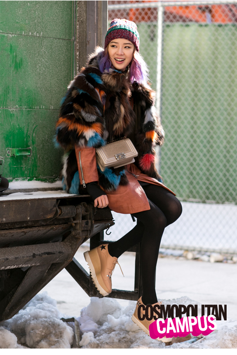 리얼 퍼코트는 부담스럽고, 너무 나이가 들어 보여 고민이었다면? 어딜 가나 주목 받는 그녀, 모델 '아이린'의 데일리룩을 참고해보자. 알록달록한 컬러를 더해 노숙한 이미지의 선입견을 완벽히 없애 주었다. 여기에 귀여움을 더 하고 싶다면 숏 비니를 같이 매치하는 것도 또 하나의 방법.