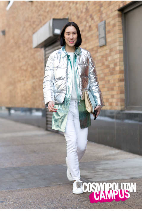 추워서 따뜻한 옷을 찾고 싶은데, 패딩은 너무 촌스러워 못 입겠다고? 럭키매거진의 편집장 '에바 첸'은 쇼트 패딩과 화이트 팬츠로 이렇게 센스 있는 룩을 선보였다. 길거리를 그냥 걸어도 일상이 화보인 그녀처럼 쇼트 패딩과 얇은 아우터를 겹쳐 입는다면 패션과 추위를 동시에 잡을 수 있다.