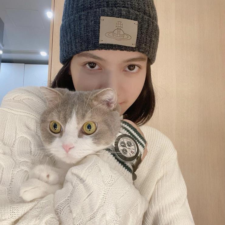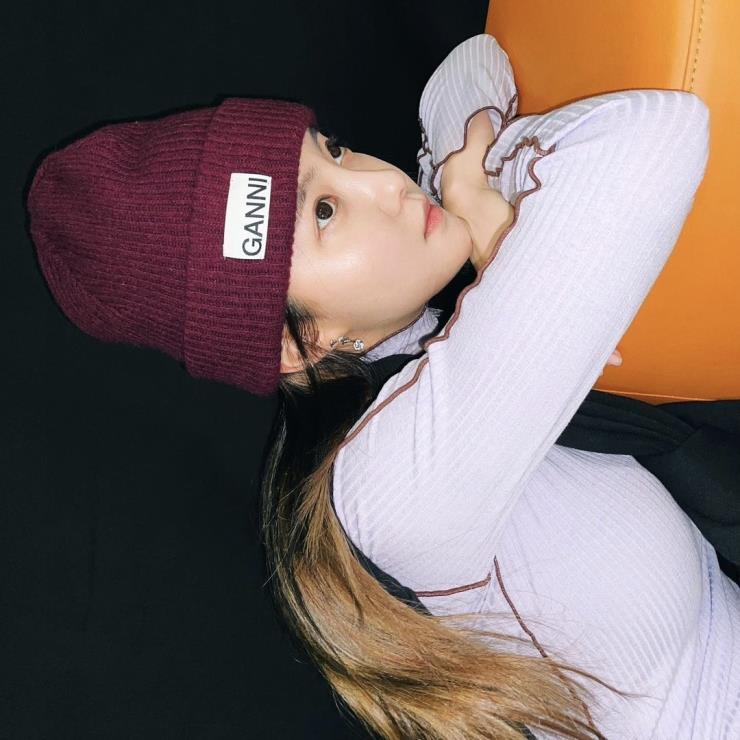 효민은 요즘 핫한 가니(ganni) 브랜드의 비니를 택했어요. 가니 비니는 큼지막한 로고가 캐주얼한 느낌을 더하죠. 효민은 포인트가 될 수 있는 퍼플 컬러를 썼네요.