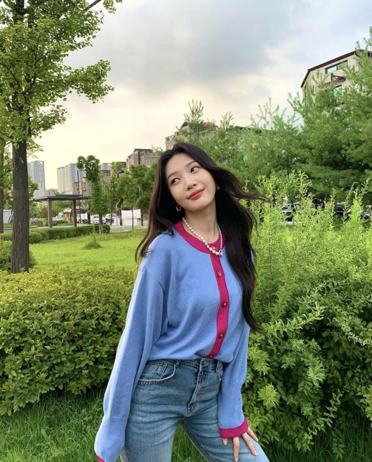 조이는 카디건에 진주