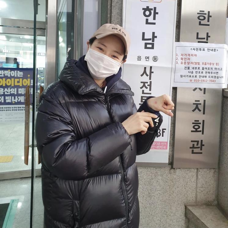 지난해 12월 결혼 소식을 밝힌 이하늬! 현재 첫아이를 임신 중이죠. 그녀는 숨길 수 없는 D라인을 공개하며 “이른 아침 사전투표하니 줄 안서고 빠르게 할 수 있어 좋네요. 퉁퉁 부은 눈이지만 뭔가 마음이 뿌듯! 숙제 빨리 한 느낌쓰~”라는 글을 덧붙였어요.