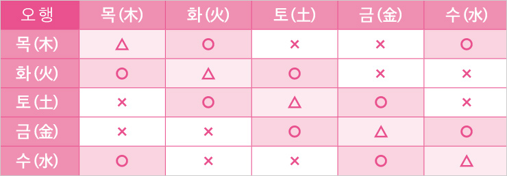 다음의 표는 사주풀이에서 태어난 날짜의 첫 번째 글자인 일간(日干)을 기준으로 본 궁합이다. 일간은 인터넷 만세력이나 만세력 앱 등으로 확인 가능하다. 결혼을 했건 아니건 궁합을 보는 이유는 그것으로 상대를 물리치기보다는 좀 더 이해하고 위로와 험난한 세상을 살아갈 용기를 주기 위함이라는 사실을 잊지 말 것.