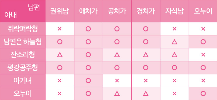 다음은 아내의 유형이다. 첫 번째로 ‘쥐락펴락형’이다. 가정의 모든 권한을 쥐락펴락해야 직성이 풀리는 타입으로, 무조건 가정에서 우위에 서야 마음이 편하다. 두 번째는 ‘남편은 하늘형’이다. 자신의 성깔과 상관없이 남편의 기와 권위를 살려주며 왕처럼 모시는 여자다. 이 유형의 여자는 남편이 어떤 부탁을 해도 순순히 들어준다. 세 번째는 ‘잔소리형’이다. 부부 사이에 잔소리를 아예 안 할 수야 없겠지만 같은 내용의 잔소리를 반복적이고 강도 있게 연거푸 해대면서 남편의 피를 말리는 유형이라 할 수 있다. 네 번째는 ‘평강공주형’이다. 바보 온달을 장군으로 만든 평강공주처럼 남편과 가족에게 한평생 봉사하며 희생하는, 이른바 내조의 여왕이다. 다섯 번째는 ‘아기녀’다. 남편 자리에 부모가 들어와 있어 부모의 무조건적인 내리사랑을 남녀 관계에서 찾으려 하는 유형이다. 이 경우 지나치게 사랑을 갈구하는 아내로 인해 곁에 있는 남편이 피로의 늪에 빠질 수 있다. 마지막으로 ‘오누이’는 남편의 유형과 같다. 편안한 친구나 오누이 사이로 남자를 바라본다는 것은 남녀 간에 대등하고 동등한 관계를 원하는 것이지만, 남자 입장에서는 상대가 자신을 만만하게 여긴다고 느낄 수 있다.