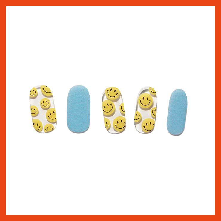 손톱이 비치는 클리어 베이스에 키치한 스마일 디자인을 매치했다. 액상 젤을 구워 만든 스티커 타입.