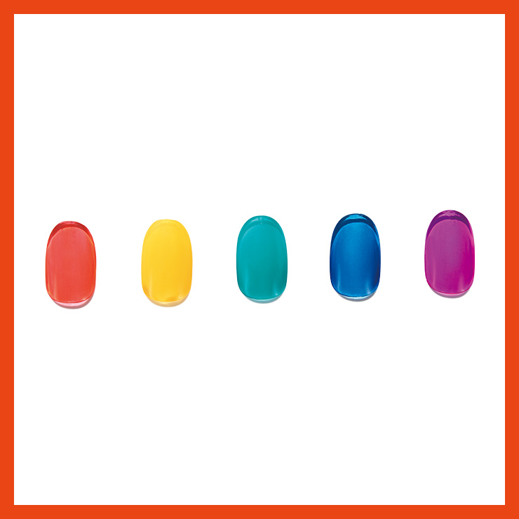 선명한 컬러감과 손톱이 비치는 투명함이 돋보이는 젤리 텍스처의 네일 폴리시. 건조가 빠른 것이 장점.