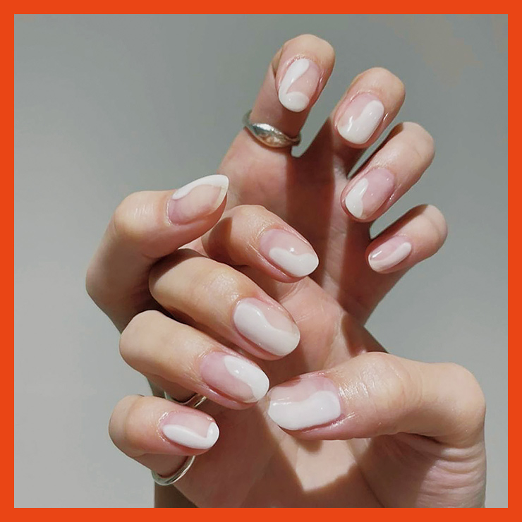 」시스루 네일의 대명사, 프렌치 네일. 정갈하게 선을 긋는 프렌치는 이제 그만! 자유분방하게 붓 가는 대로 그려 넣는 아티스틱한 웨이브 프렌치가 대세다. 여백을 얼마나 주는지, 어떤 컬러를 사용하는지에 따라 분위기는 천차만별. 진한 색을 사용할수록 라인을 깔끔하게 정리해야 지저분해 보이지 않는다. 붓 터치와 스킬에 자신 없는 똥망손 뷰린이라면 스킨 톤에 가까운 은은한 컬러를 선택하자.