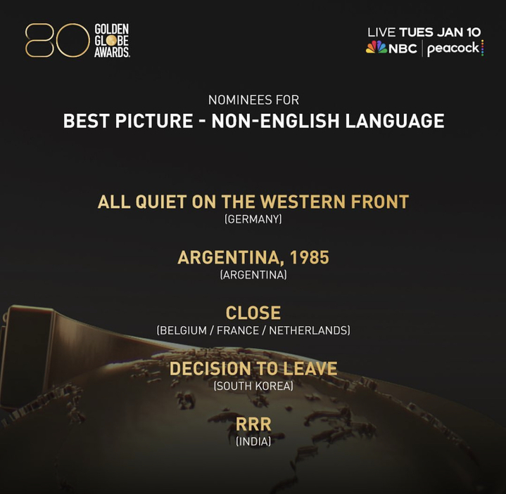 박찬욱 감독의 <헤어질 결심>은 인도 SS 라자몰리 감독이 연출한 넷플릭스 영화 <RRR>, 독일 에드바르트베르거 감독의 넷플릭스 영화 <서부 전선 이상 없다>, 벨기에 루카스 돈트 감독의 <클로즈>, 아르헨티나 산티아고 미트레 감독의 <아르헨티나, 1985>와 경쟁한다.
