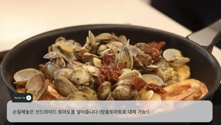 4. 새우가 익으면 바지락과 육수, 마늘, 썬드라이드 토마로를 다시 넣고 섞어준다.
