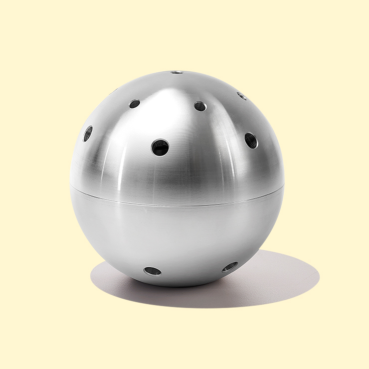 묵직한 존재감을 지닌 메탈 소재의 원형 인센스 버너. 구 속에 인센스를 넣고 닫으면 구멍을 통해 연기가 흘러나와 오묘한 느낌을 준다. 인센스가 구 내부에서 타 가루 날림이 없다.