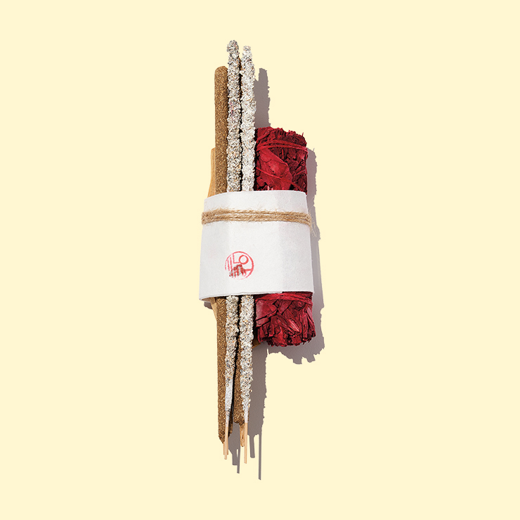 달콤한 세이지 스머지 스틱과 치유 작용에 도움을 주는 팔로산토 우드 스틱, 5가지 레진을 블렌딩한 인센스 스틱과 페루 장인이 수작업으로 롤링해 만든 인센스 스틱 총 4가지 제품으로 구성된 세트.