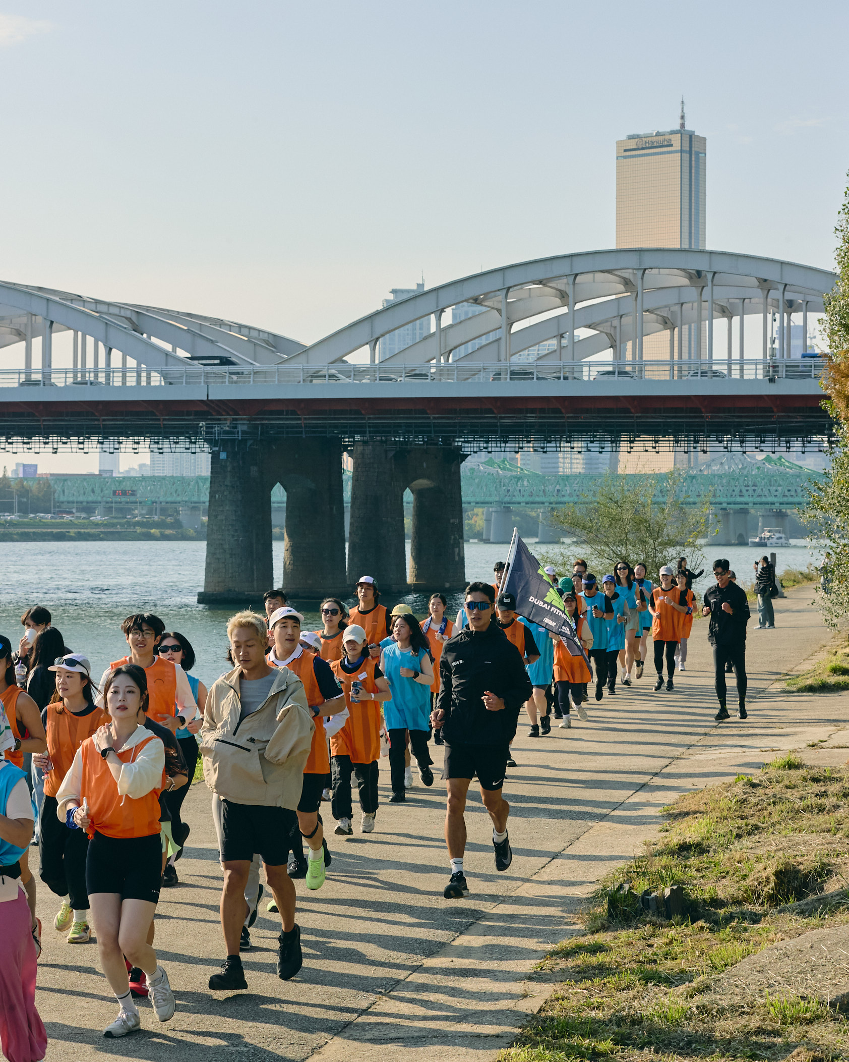 63빌딩을 배경으로 한강변을 달리는 러닝 클래스.