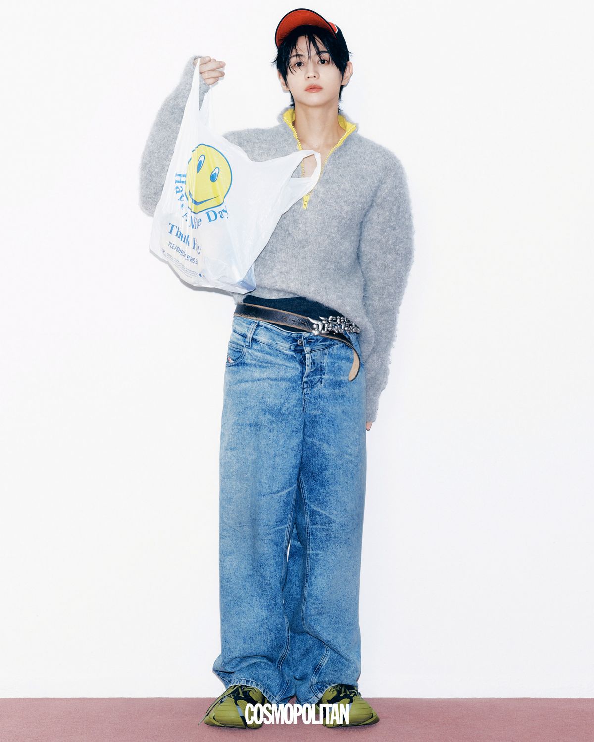니트 톱, 데님 팬츠, 볼캡, 벨트 모두 Diesel. 스니커즈 Camper.